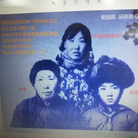 媽媽年輕時的樣子我沒有見過,但從這張照片看,媽媽年輕時是很漂亮很溫柔的?,F(xiàn)在媽媽年紀大了,我會好好陪伴您,像小時候您陪伴我一樣。